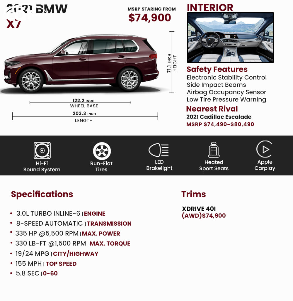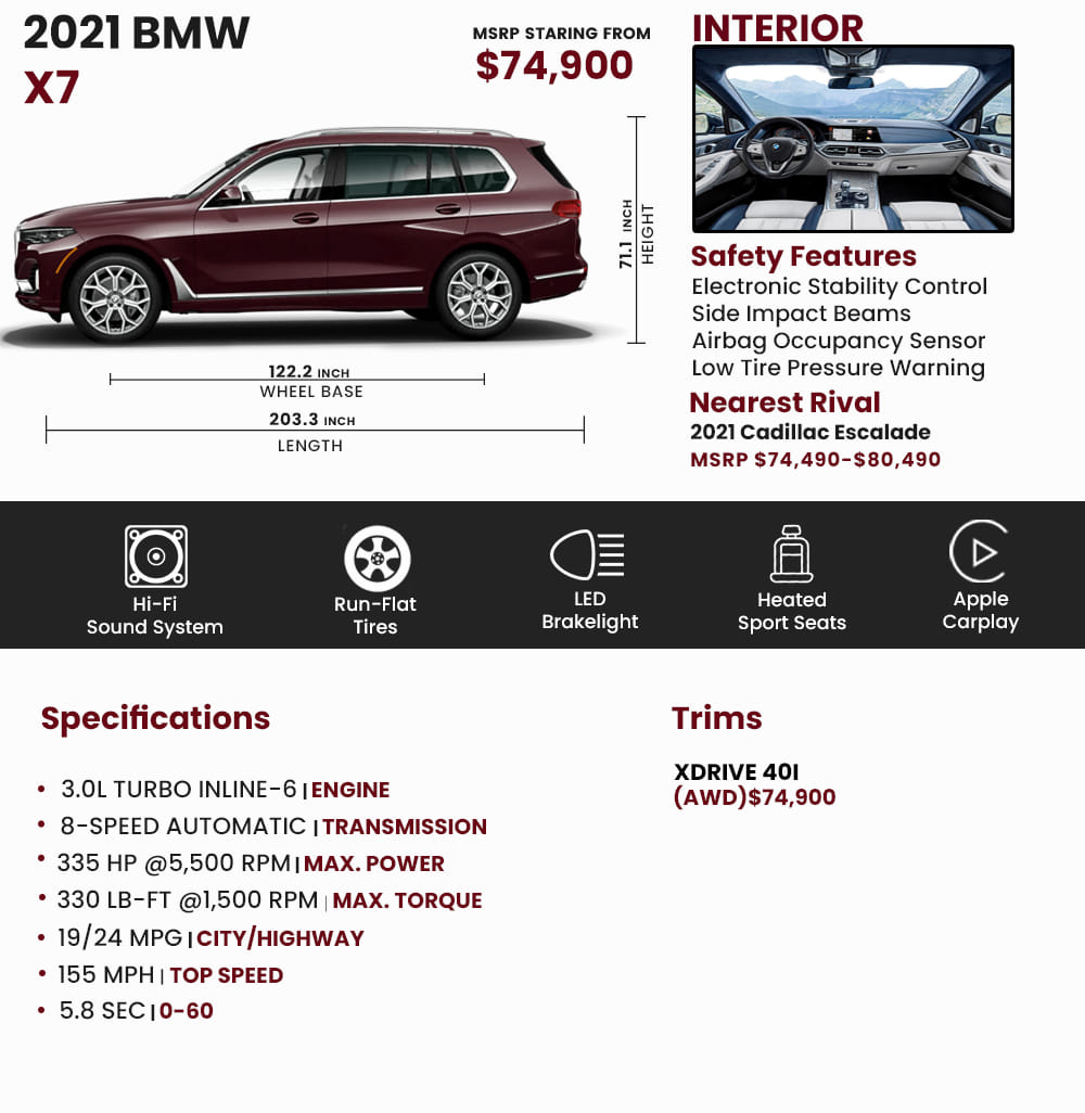Select up to 3 trims below to compare some key specs and options for the 2021 BMW X7. For full details such as dimensions cargo capacity suspension colors and brakes click on a specific X7 trim. Get detailed information on the 2021 BMW X7 including specifications and data that includes dimensions engine specs warranty standard features options and more.